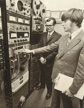 left and right show him changing tapes and working on equipment. His son, Owen, explained the