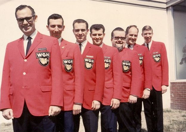 (PHOTO BELOW) WGH personalities George Crawford, Glenn Lewis (with his "Turtle" lapel button), Dave Cummins, Dick Lamb, Bob Calvert, Roger Clark, and Gene Loving standing in front of the old Mercury Boulevard studios in Hampton in 1966. (Courtesy Bill Bass, Chris Astle, and Ambert Dail )